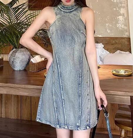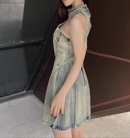 2024春夏新作 女 レディース ハイウエスト 袖なし デニム ミニ ワンピース ドレス 台型スカート