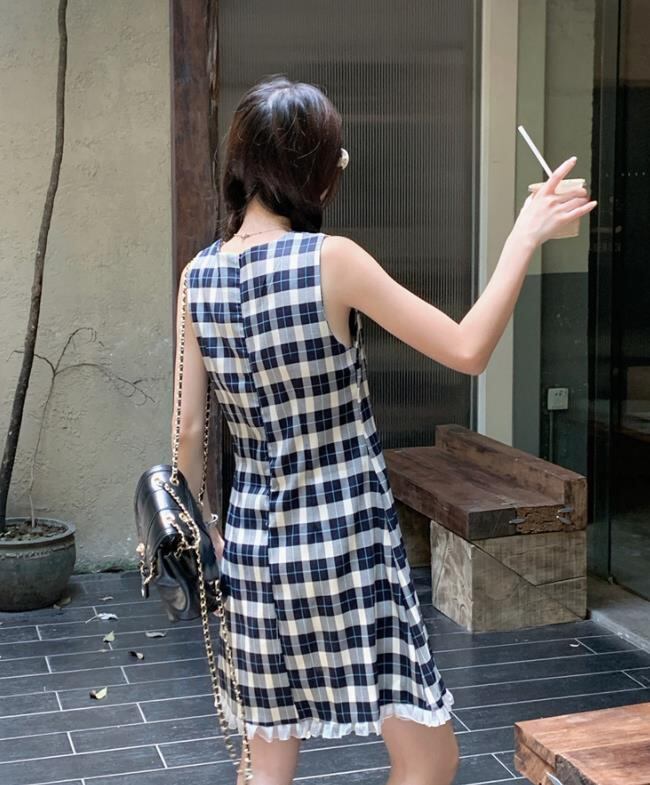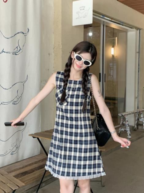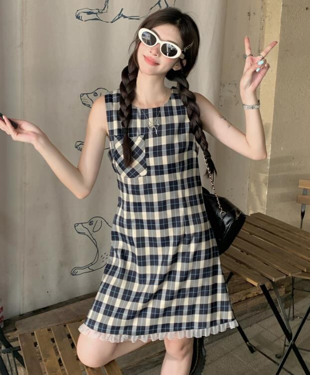 2024春夏新作 女 レディース 袖なし チェック柄 ミニ ワンピース ドレス 台型スカート S/M