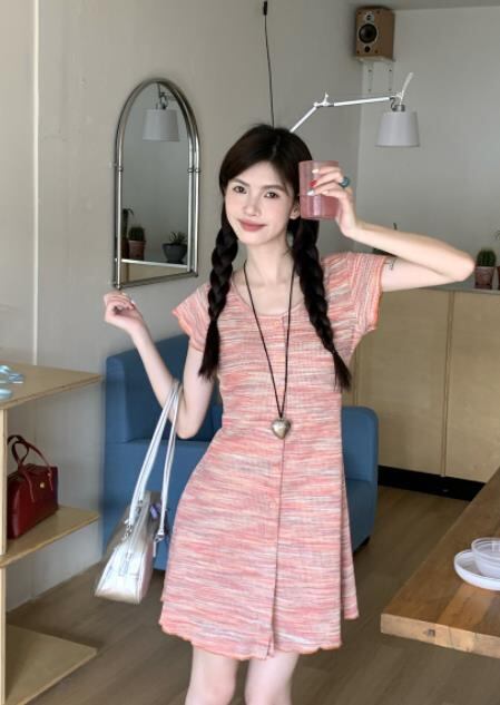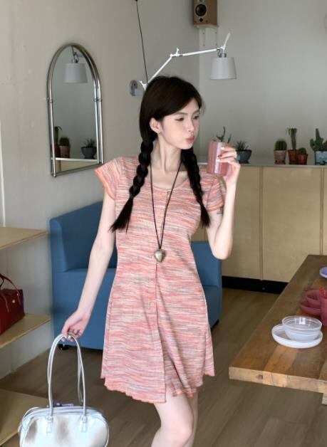 春夏新作 女 レディース ハイウエスト 半袖 ボーダー柄 ミニ ワンピース ドレス 台型スカート