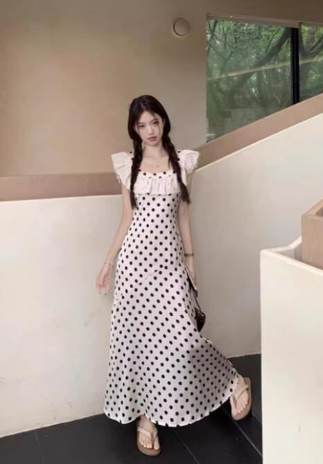 2024春夏新作 女 レディース ハイウエスト 袖なし ドット 吊りスカート ロング ワンピース 台型スカート