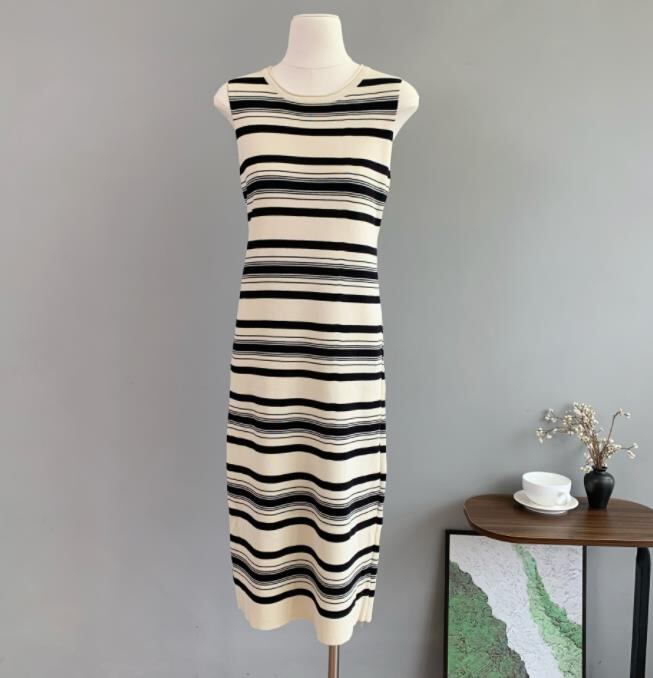 春夏新作 女 レディース ハイウエスト 袖なし ニット ボーダー柄 ロング ワンピース 台型スカート