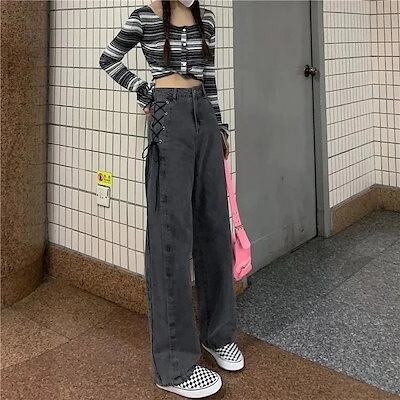 デニムワイドパンツ 秋新作 スモークグレー バンドジーンズ 着痩せ ins ゆとりがある ストレートワイドパンツ 韓国ファッション 百掛け やせて見える