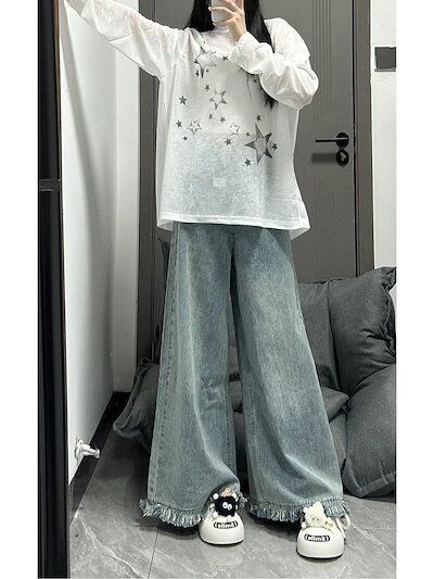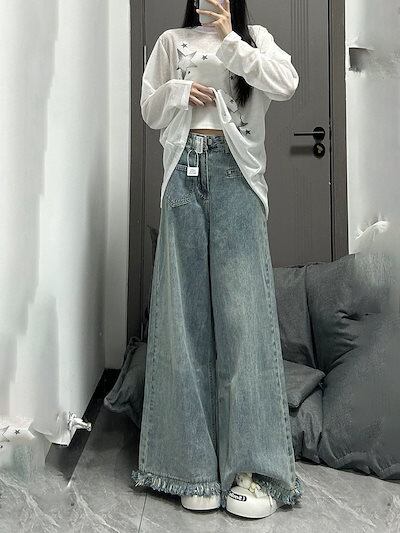 フリルがレトロなワイドパンツレディース春秋2024年新作デザイン感ハイウエストゆったりドレープ感モップスカート