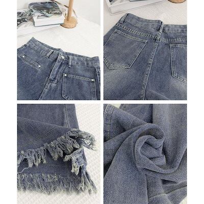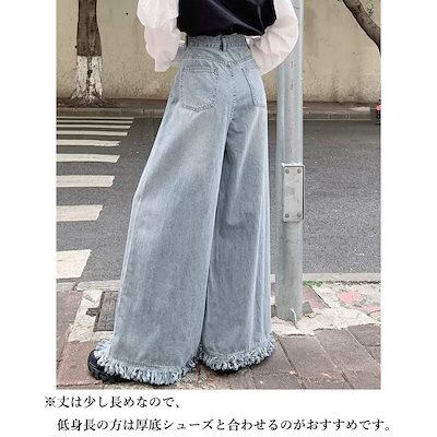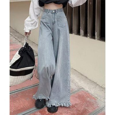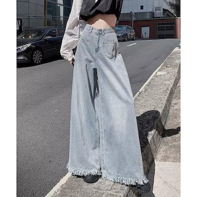 流行のスタイル デニムパンツ レディース ジーンズ ワイドデニムパンツ 裾フリンジ ジーパン