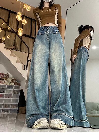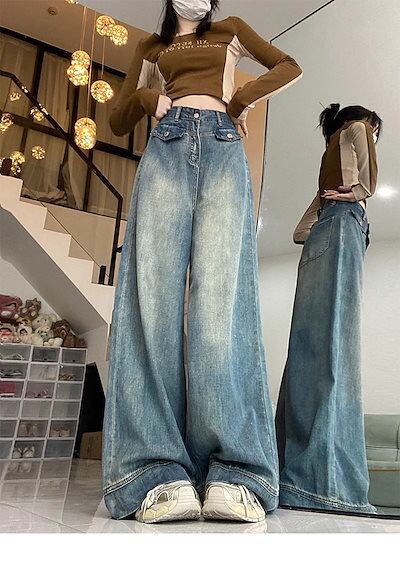 秋冬の新作 デニムパンツ ヴィンテージストレートジーンズ レディース 大きいサイズ ハイウエスト ゆったり ワイドパンツ