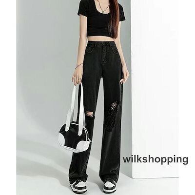 ダメージジーンズ レディース デニムパンツ ダメージ ジーンズ デニム パンツ ボトムス ワイドパンツ ワイドデニム ハイウエスト ダメージパンツ 太もも