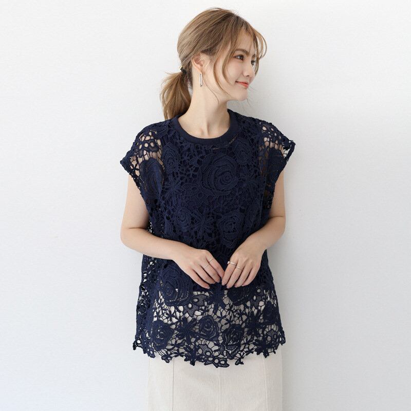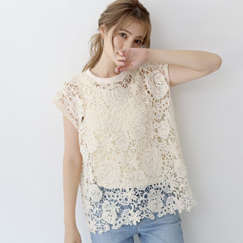 2023夏INS新作★韓国風 気質 スウィート プルオーバー 透かし彫り レース 半袖 2点セットアップ