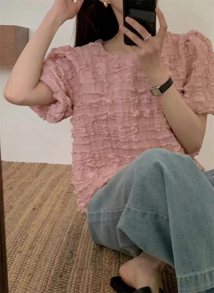 見る角度で印象が変わる ブラウス キメ感 パフスリーブ レディース 上着 フォールド 半袖 シャツ