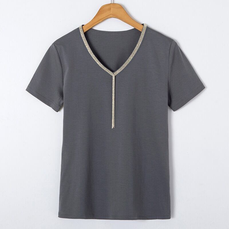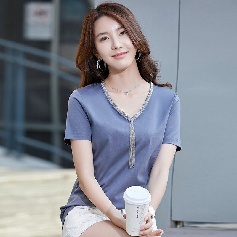 夏の新しいスタイル 半袖 T シャツ 女性 V ネック シルケット コットン トップ