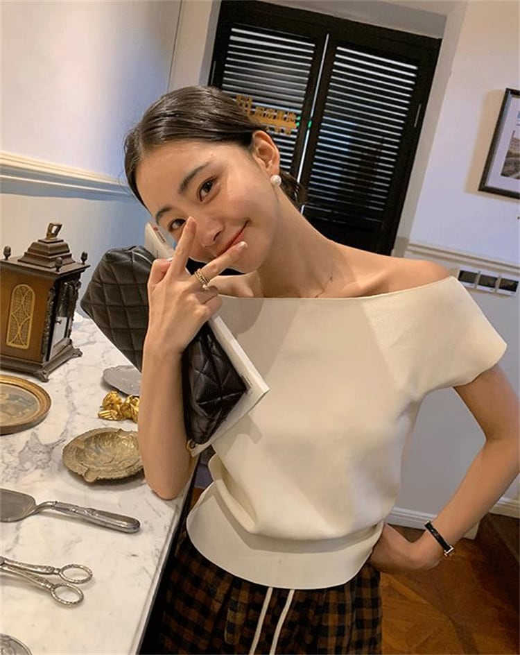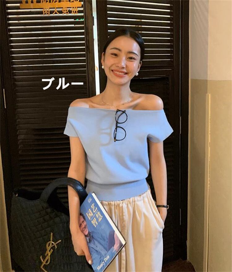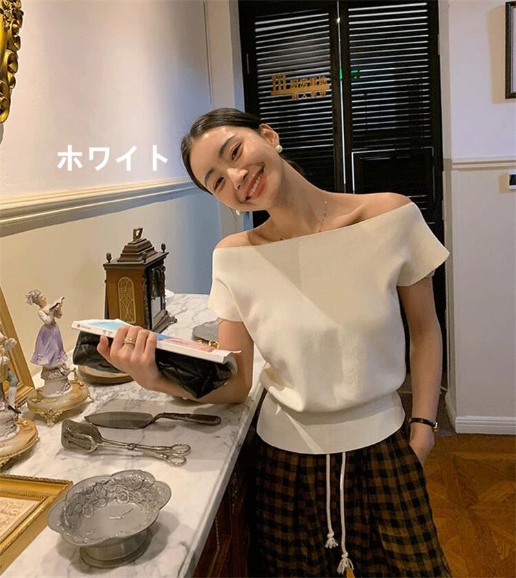 履くだけでこなれ感 ニットトップス 夏 薄手 オフショルダー 半袖 スリムフィット 上着 シンプル