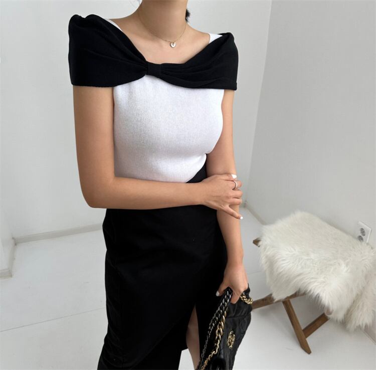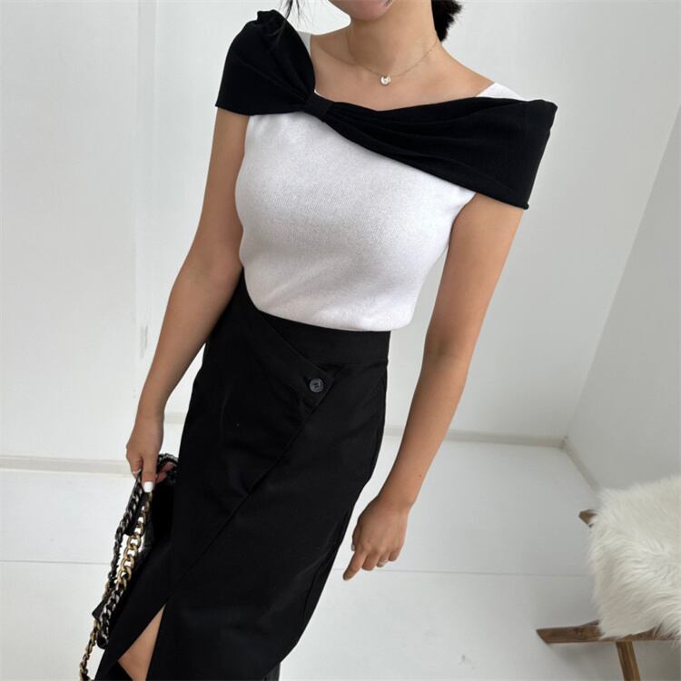 満足してます ニットトップス 気質 上着 怠惰な風 スリム 一言の肩 大人気 トレンド エレガント 半袖