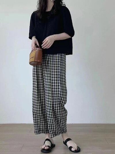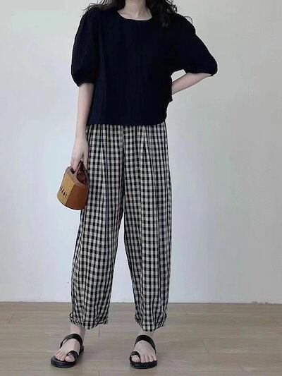 バルーンパンツ レディース コクーンパンツ サーカスパンツ 大きいサイズ 綿麻 パンツ コットンリネン チェックパンツ ワイドパンツ イージーパンツ 大人可愛い ナチュラル カジュアル服 ゆったり ウ