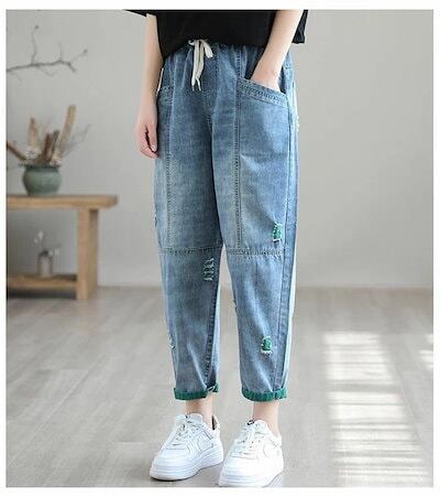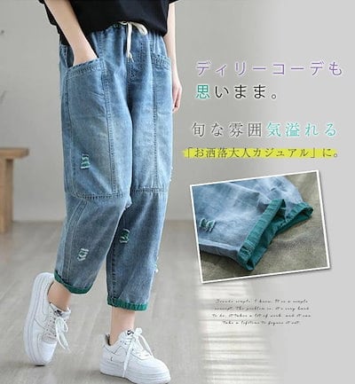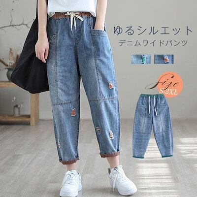 デニムパンツ 春 レディース テーパードパンツ ワイド ボトムス チノパン ジーパン ロールアップ 森ガール 春 無地 ズボン ウエストゴム 大きいサイズ 柔らかい ゆったり 体型カバー 薄手 オシャ