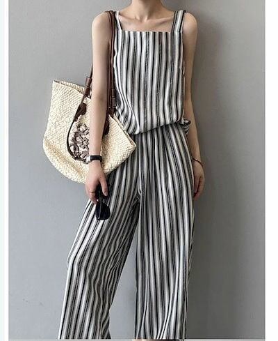 セットアップ レディース 夏 2点セット 薄手 上下セット キャミソール ワイドパンツ フレアパンツ 涼しい カジュアル ナチュラル 大きいサイズ ゆったり 体型カバー ふんわり 爽やか ストライプ
