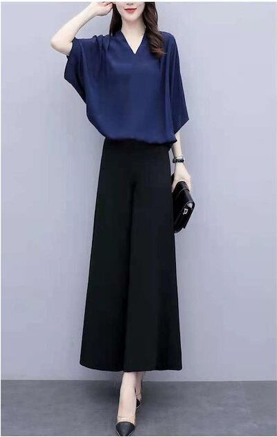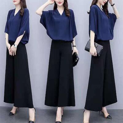 パンツドレス 結婚式 セットアップ レディース 大きいサイズ きれいめ 上下セット 卒業式 体型カバー 2点セット Vネック ワイドルーズ 着痩せ お洒落 二次会 パーティー 通勤 入園 パンツ パン