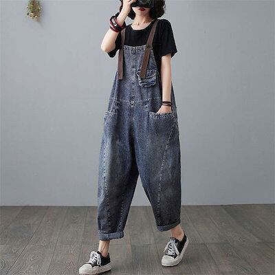 デニムサロペット サロペット デニム 大きいサイズ ワイド パンツ レディース オーバーオール オールインワン サスペンダー キャンプ カジュアル ロング 体型カバー ゆったり 楽ちん 大人 デニムワ