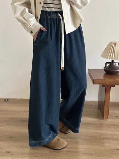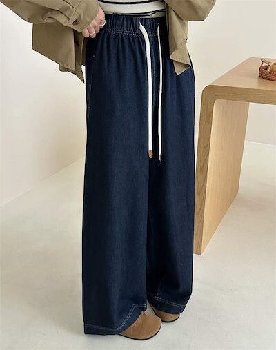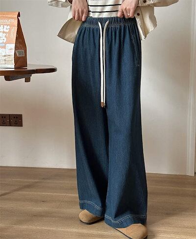 デニム パンツ レディース 秋 冬 オールシーズン ワイドパンツ ロング丈 ウエストゴム 無地 ジーンズ ボトムス ゆったり ストレートパンツ コットン 楽ちん デニムパンツ 体型カバー 大きいサイズ