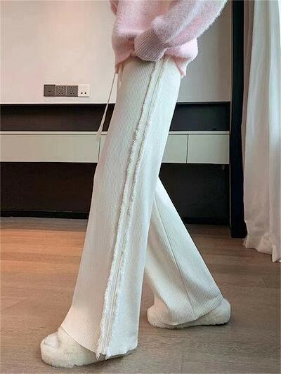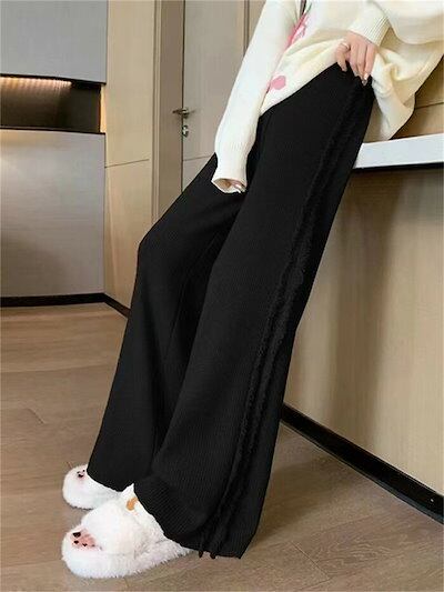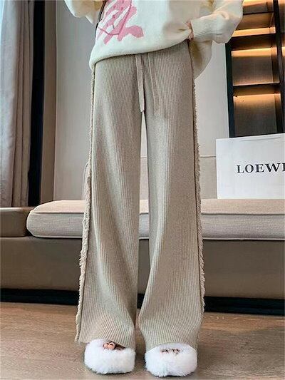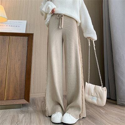 パンツ レディース リブニット きれいめ ニット ストレッチ 秋 冬 ワイドパンツ 暖か ストレート ウエストゴム リブ イージーワイドパンツ ボトムス 楽ちん 厚手 ゆったり ロング 大きいサイズ