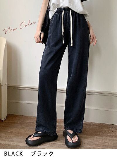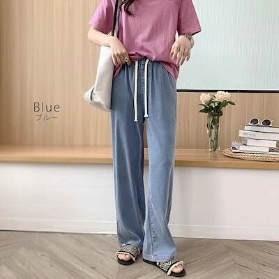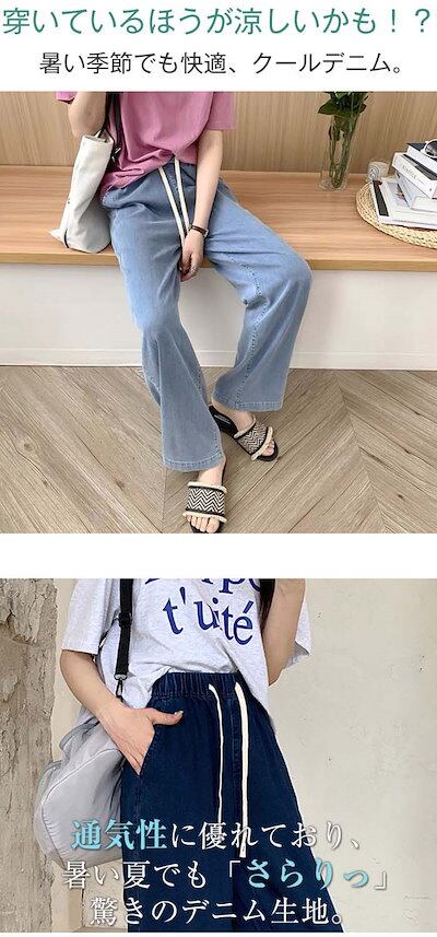デニムパンツ レディース ロング パンツ ボトムス 春夏 ジーンズ ストレート ワイド 無地 ウエストゴム 接触冷感 薄手 涼しい ロング丈 ジーンズ ジーパン ひんやり 大きいサイズ UVカット ゆ