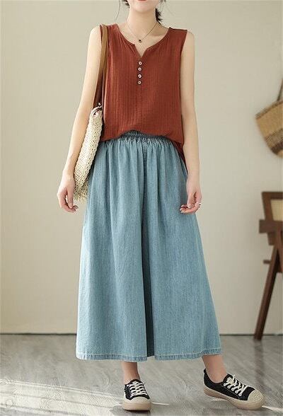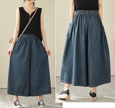 デニム フレアパンツ 七分丈 デニムパンツ 薄手 夏 ワイドパンツ レディース デニム ガウチョパンツ デニムワイドパンツ 夏 秋 春 大きいサイズ ゆったり ボトムス 春夏 イージーパンツ 体型カバ