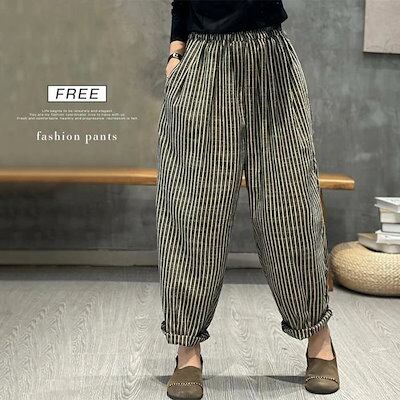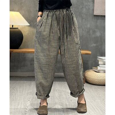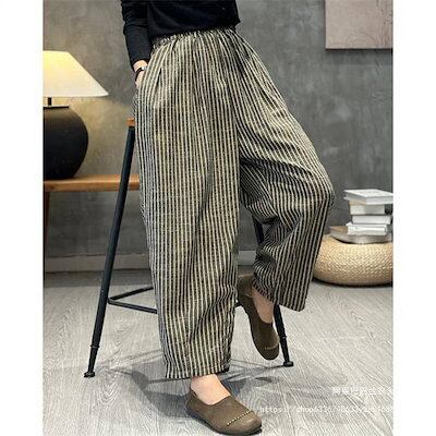 ワイドパンツ レディース 綿麻風 きれいめ ストライプ 春 秋 レディース カジュアル ギャザーパンツ 大きいサイズ ゆったり ボトムス タック 体型カバー ウエストゴム リラックス 着痩せ 美脚 通
