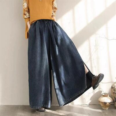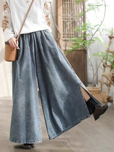 ワイドパンツ デニムパンツ ガウチョパンツ パンツ レディース 春 夏 秋 サイドスリット ガウチョ ワイドパンツ ロング丈 パンツ デニムワイドパンツ ゆったり 体型カバー 大きいサイズ ボトムス
