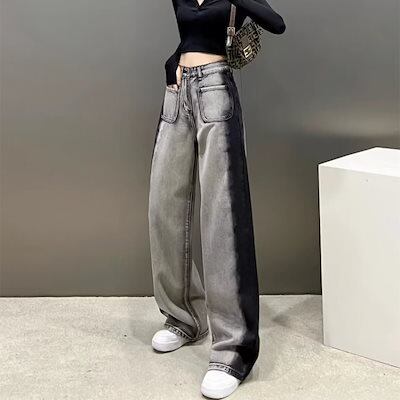 ワイドパンツ ブラックストレートワイドレッグドラッグジーンズレディース2025春新作スキニー