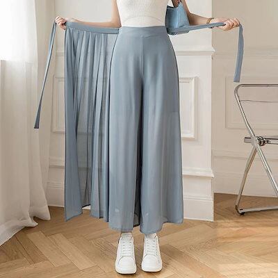韓国 ファション 春夏 2024新作 ギャザーシフォンワイドパンツレディースサマーハイウエストベルト付きアイススカートカジュアル九分丈スカート
