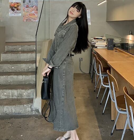 全2色 デニムワンピ 長袖 切り替え スリム 着痩せ デニム ベルト付き 【大きいサイズあり】