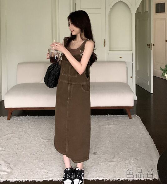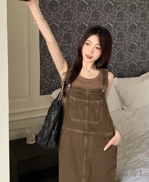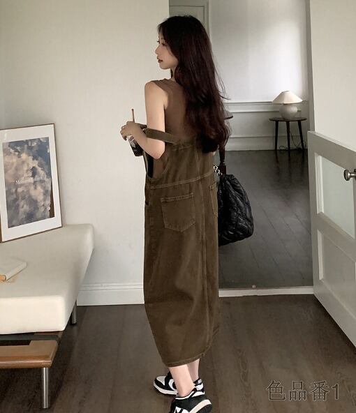デニムワンピ ノースリーブ フリル 切り替え スリム 着痩せ デニム 【大きいサイズあり】