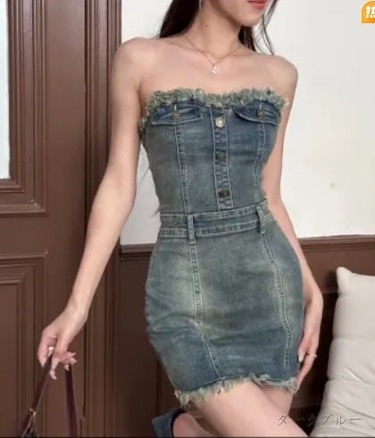 デニムワンピ チューブトップ 切り替え スリム 着痩せ デニム シンプル
