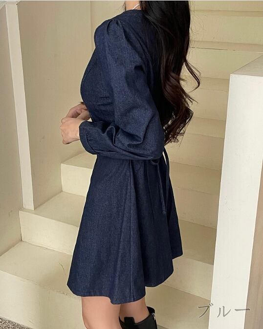 全2色 デニムワンピ フリル 切り替え スリム 着痩せ デニム シンプル