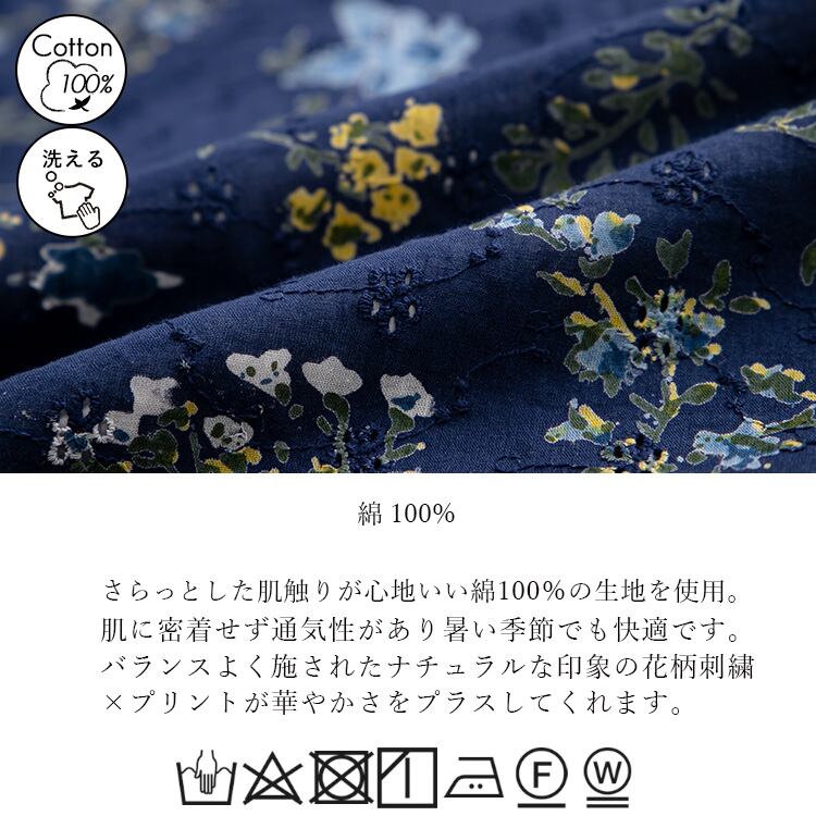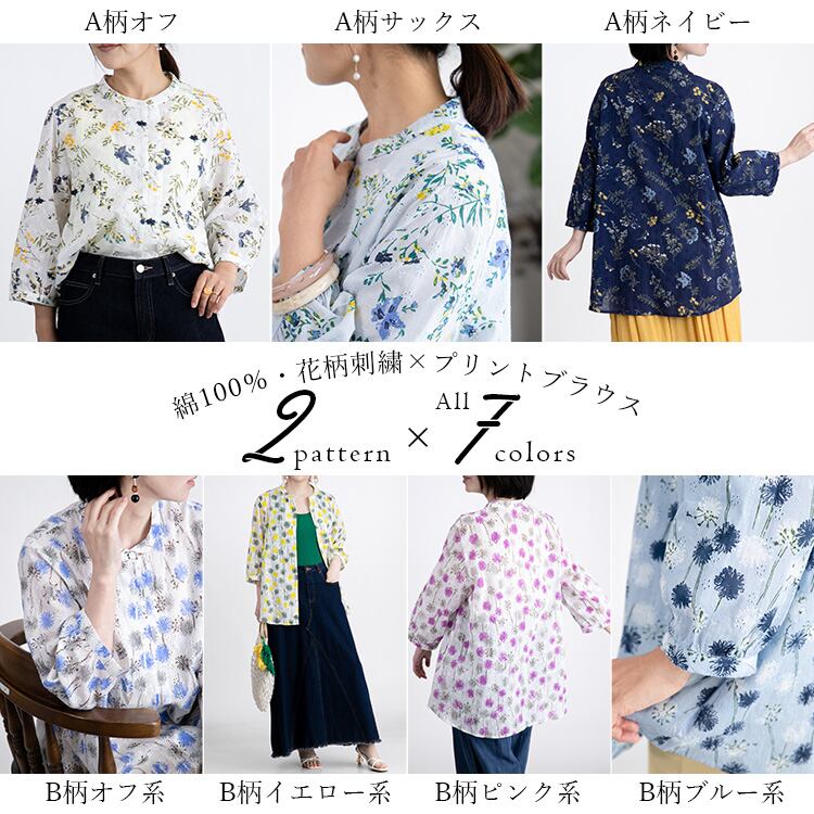 【綿100%】ボタニカルプリント×刺繍ブラウス コットン 天然素材 刺繍 植物 花柄 プリント 7分袖