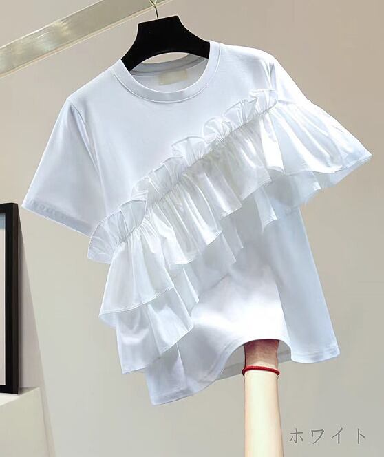 全3色 半袖Tシャツ フリル 切り替え 体型カバー 着痩せ 無地 sweet系