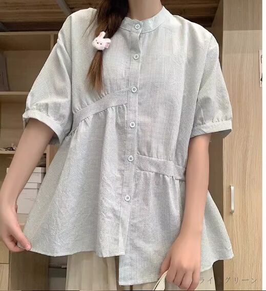 半袖シャツ アシンメトリー ボリューム袖 切り替え 体型カバー 着痩せ sweet系