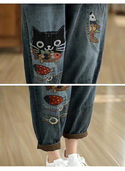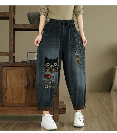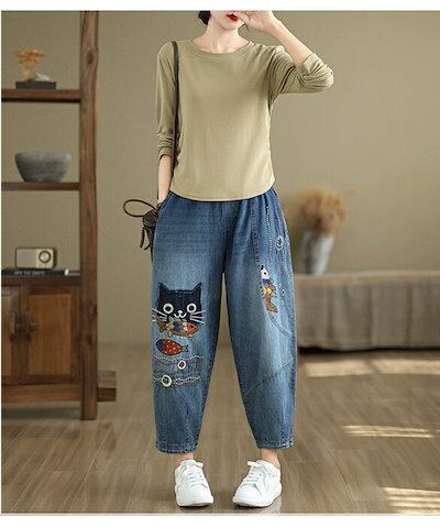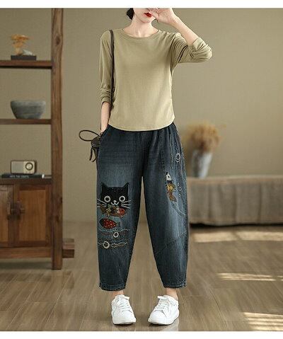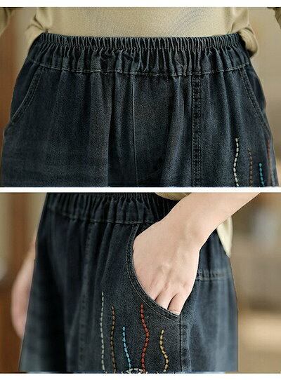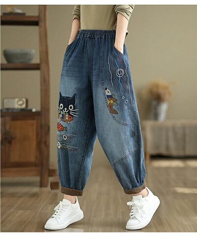 デニムパンツ ロング レディース 春秋 猫 ネコス テーパードパンツ 可愛い きれいめ パンツ ハイライズデニムパンツ ウエストゴム ロング デニム 大人気 ボトムス ワイドデニム ロールアップ ノア