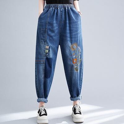 配布中!レディース パンツ 春 カジュアル デニムパンツ 大きいサイズ ボトムス ワイド デニム デニムテーパードパンツ ハイライズデニムパンツ 可愛い ロング ボトムス ワイドデニム ロールアップ
