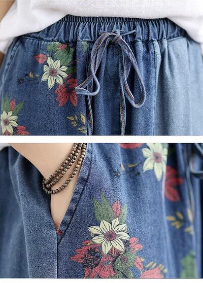 パンツ 春夏 デニムパンツ ワイドパンツ 花柄 レディース 大きいサイズ かわいい 女の子 可愛い きれいめ ガウチョパンツ スカーチョ バギーパンツ テーパードパンツ ウエストゴム ロング ボトムス