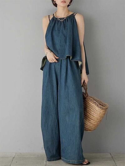 セットアップ パンツセット デニム 新作 キャミソール ワイドパンツ 無地 綿 ロング パンツ ノースリーブ カジュアル ストリート 可愛い お出かけ 旅行 デート 女子会 レディース 春 夏 上下セ