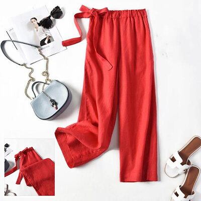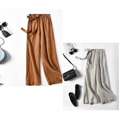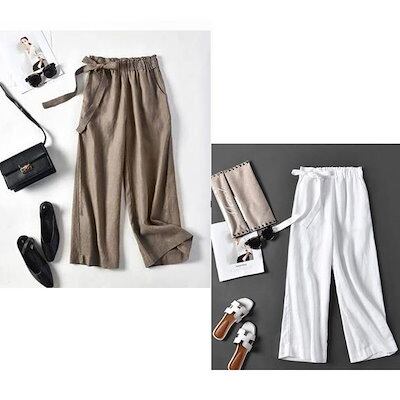全7色×5サイズ!サイドリボン付 リネンワイドパンツ リネン パンツ ワイドパンツ ガウチョパンツ 無地 レディース ゆったり ワイドパンツ 麻 麻混 きれいめ 春夏 リボン かわいい