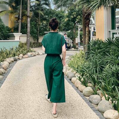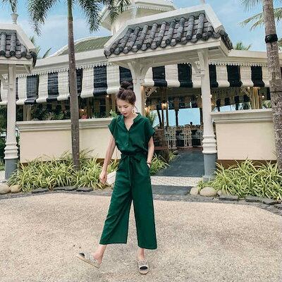 レディース ジャンプスーツ ワイドレッグパンツ 半端丈 クロップドパンツ オールインワン サロペット 大人カジュアル きれいめ 可愛い リゾート おしゃれ お出かけ デイリー グリーン S M L