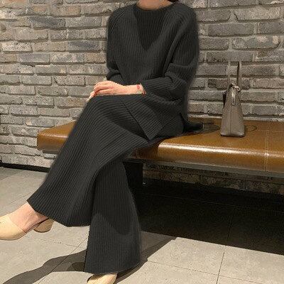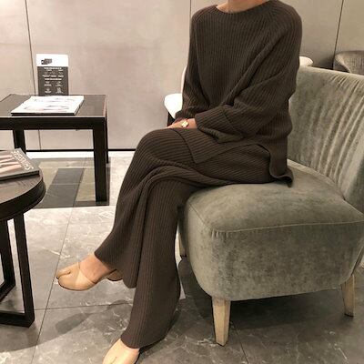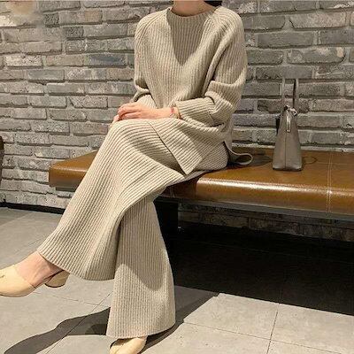 レディース セットアップ リブニット ニット ワイドレッグパンツ カジュアル 可愛い フェミニン きれいめ 上品 おしゃれ お出かけ オフィス お呼ばれ ブラウン ベージュ コーヒー ネイビー