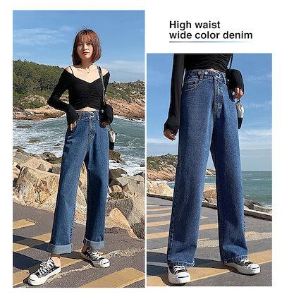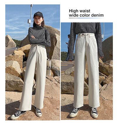 デニム レディース デニムパンツ 韓国 ワイド ジーンズ ジーパン パンツ ボトムス おしゃれ かわいい ボーイフレンド ワイド きれいめ ストレート ハイウエスト インディゴ ブラック 【メー