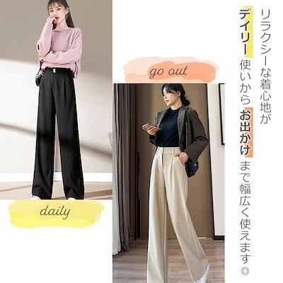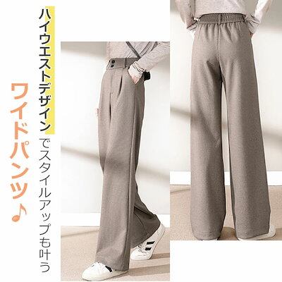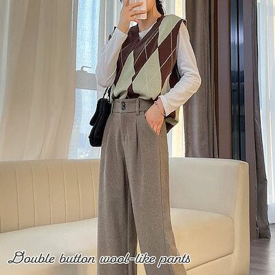 ワイドパンツ ストレートパンツ レディース ハイウエスト パンツ ウールライク ダブルボタン 秋 冬 大きいサイズ ゆったり 無地 シンプル おしゃれ かわいい ウエストゴム ワイド ズボン ロ