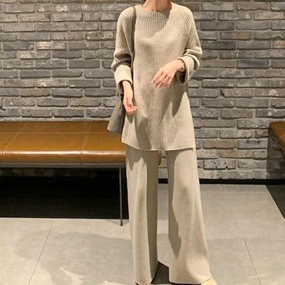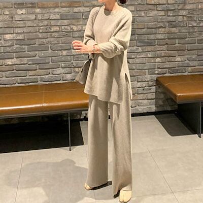 レディース 上下2点セット リブニット + ワイドレッグパンツ カジュアル 大人可愛い ボートネック きれいめ 上品 おしゃれ お出かけ オフィス お呼ばれ ベージュ ブラウン ネイビー ライト