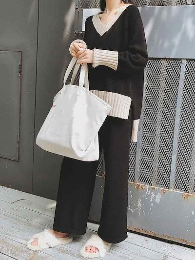 レディース 上下セット Vネック ニット セーター ワイドレッグパンツ カジュアル 可愛い フェミニン きれいめ 上品 エレガント おしゃれ お出かけ オフィス お呼ばれ ブラック M L XL 2X