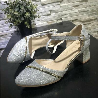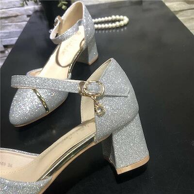 パンプス キラキラ ローヒール チャンキーヒール アーモンドトゥ ストラップ アンクルストラップ レディース 上品 ゴージャス シルバー ゴールド 結婚式 ピアノ 発表会 綺麗め パーティー シューズ