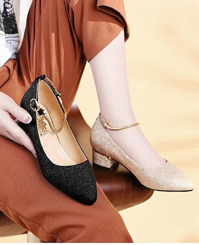 パンプス キラキラ ローヒール チャンキーヒール アーモンドトゥ ストラップ アンクルストラップ 上品 ゴージャス ブラック ゴールド 結婚式 ピアノ 発表会 綺麗め パーティー シューズ 靴 イベン