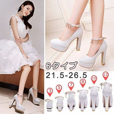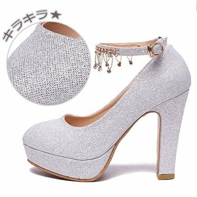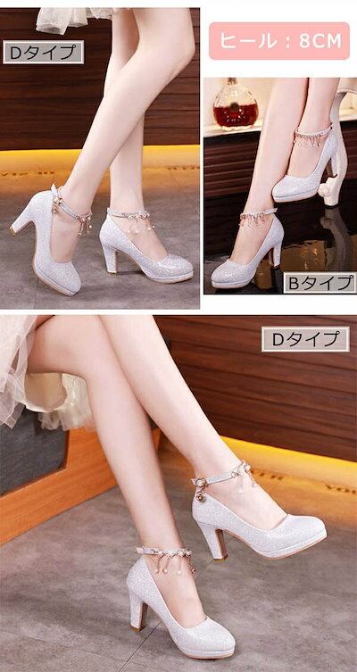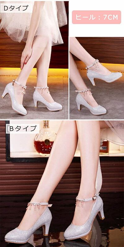 パンプス レディース キラキラ ブライダルシューズ 結婚式 ウェディングシューズ アンクルストラップ シンプル きれいめ 美脚 小さいサイズ 大きいサイズ パーティ ハイヒール ぺたんこ 太ヒール ロ