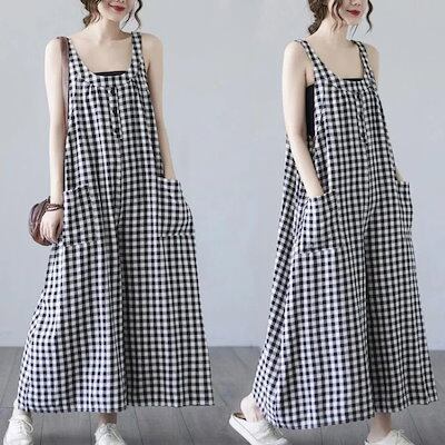 オールインワン サロペット チェック オーバーオール ガウチョ パンツ リネン ワイドパンツ ワンピース レディース 9分丈 ロング丈 ノースリーブ オーバサイズ 大きめ 春 夏